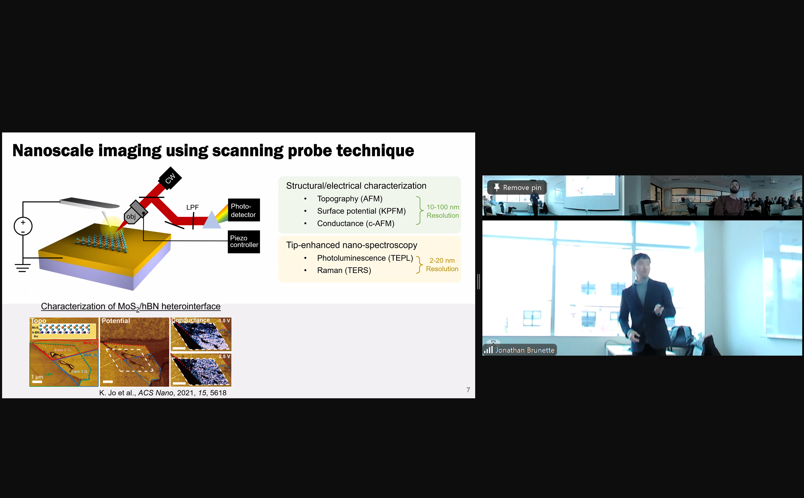 January 16th, 2025![]() | Dr. Kiyoung Jo, University of Pennsylvania | Direct sub-wavelength imaging of optoelectronic properties at 2-dimensional semiconductor- metal interfaces | Metal contact to two-dimensional semiconductors is one of the most consequential aspects for achieving high-performance and large-scale electronic and optoelectronic devices. As semiconductor materials are thinned down to the nanometer limit, the contact becomes a dominant factor governing device behavior. However, the chemistry of the contact remains poorly understood because semiconductor-metal contacts are buried interfaces, making them difficult to probe directly. In the first part of this talk, I will present spatial imaging of optoelectronic characteristics of 2D transition metal dichalcogenides (TMD)- metal interfaces. Using a unique metal assisted flipping technique, we are able to access TMD contacts with various metals (Au, Ag and In) to probe their electrical and optical properties. By leveraging scanning probe microscopy coupled with spectroscopy, we performed kelvin probe force microscopy, conductive-AFM, tip-enhanced Raman and photoluminescence spectroscopy. This approach enables concurrent mapping of electrical potential, conductivity, strain and emission spectra at the interface with deep-subwavelength (5-20 nm) spatial resolution. In the second part, we will discuss the excitonic emission within strain-localized WSe2 nanobubbles (50-100 nm in diameters) under different electrical contact environments, such as Schottky and Ohmic contacts. We found the types of the surrounding contact significantly influences the excitonic emission of these nano-emitters, enabling changing the excitonic emission via electrical polarity. At Schottky interfaces, core/shell-like emissions are observed within the nanobubbles, whereas Ohmic contacts exhibit only strain-localized excitons. The strategies presented in this talk will provide insights for investigating diverse nanomaterial systems for applications in nano-electronics and photonics. | |